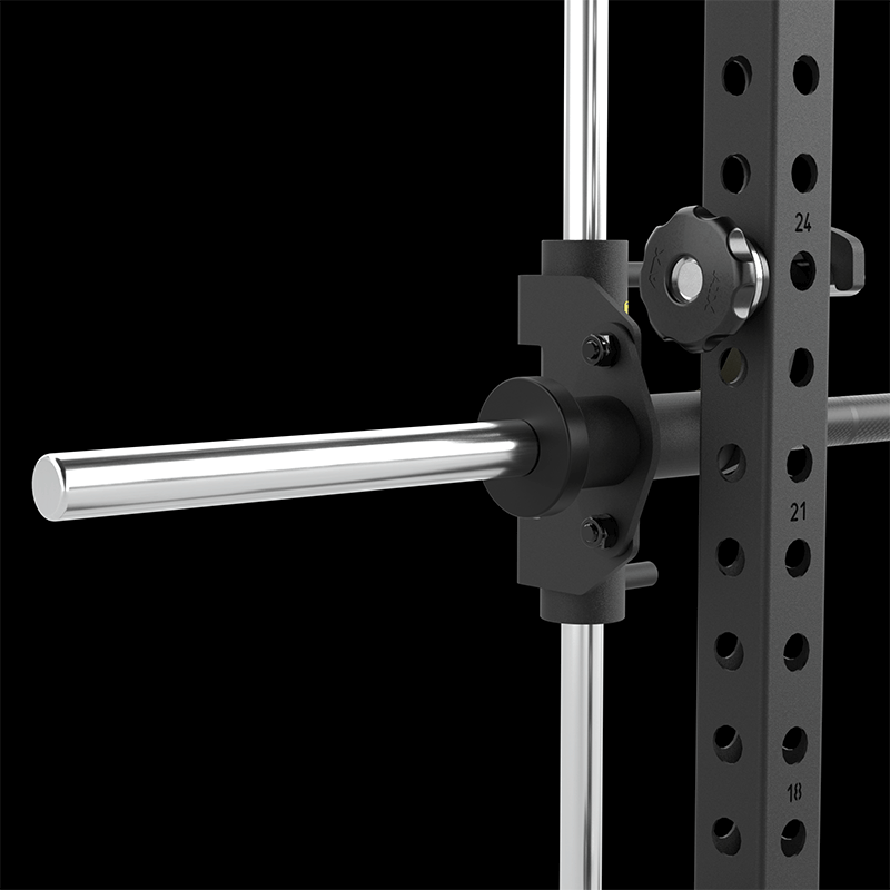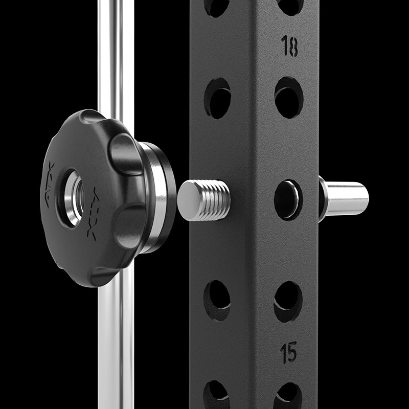 La barre d’haltères en acier Ø32 mm, moletée et chromée noir, est équipée de 6 boulons de verrouillage pour un réglage rapide et sûr des positions de départ et de fin. Les verrouillages de sécurité réglables individuellement assurent une sécurité maximale pendant l’entraînement, tandis que le support de disque Ø30 mm est convertible en Ø50 mm avec adaptateurs en option pour s’adapter à différentes charges.