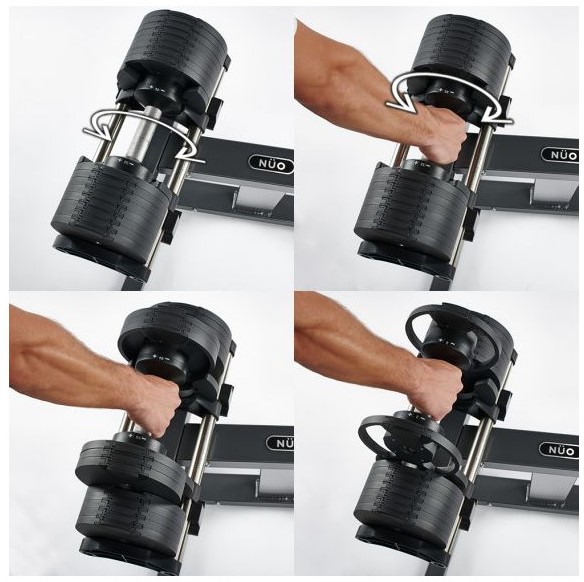 Si vous souhaitez changer de poids, vous n’avez qu’à reposer l’haltère sur son socle et choisir votre charge en faisant tourner la poignée de l'haltère. Afin de vous repérer dans le choix de vos poids, une petite fenêtre se situe sur les Nuobells vous indiquant le poids exact que vous avez sélectionné.