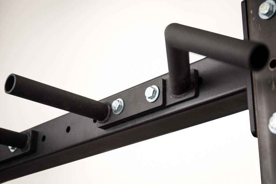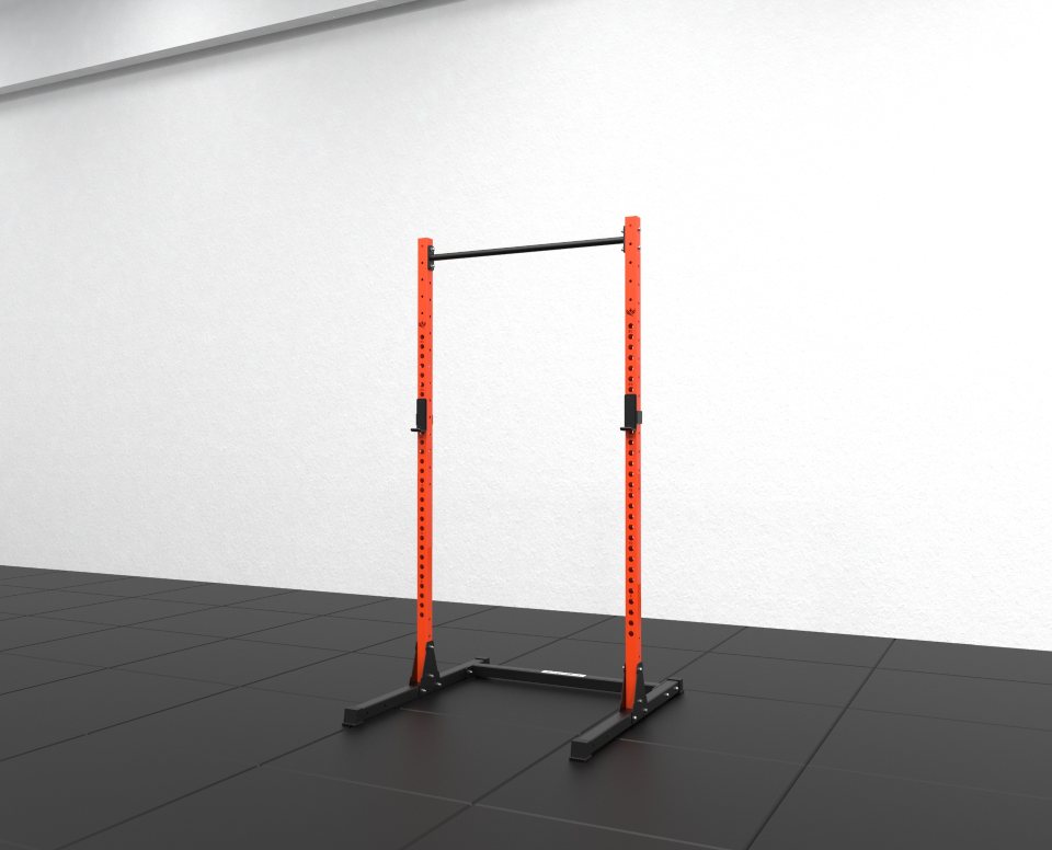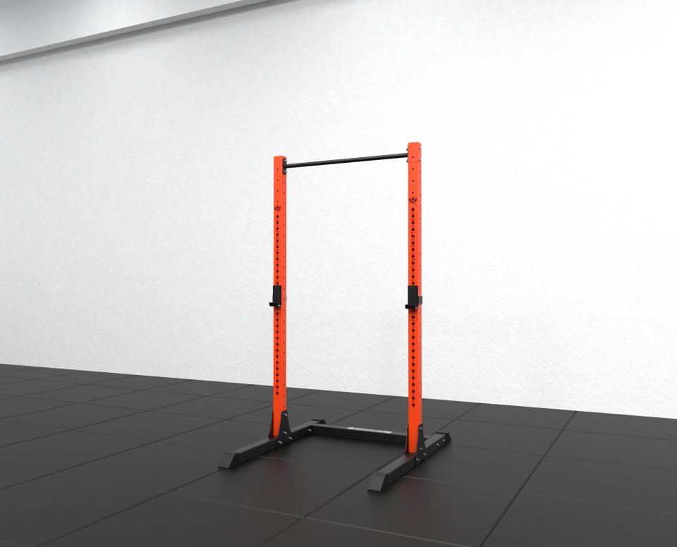 Le Royal Rack à Squat est réalisé en profilés d’acier de haute qualité avec dimensions : 60 mm x 60 mm x 3 mm, ce qui signifie qu’il pourra facilement supporter jusqu’à 450 kg et plus. Une barre de traction est également ajoutée au rack pour varier les exercices.