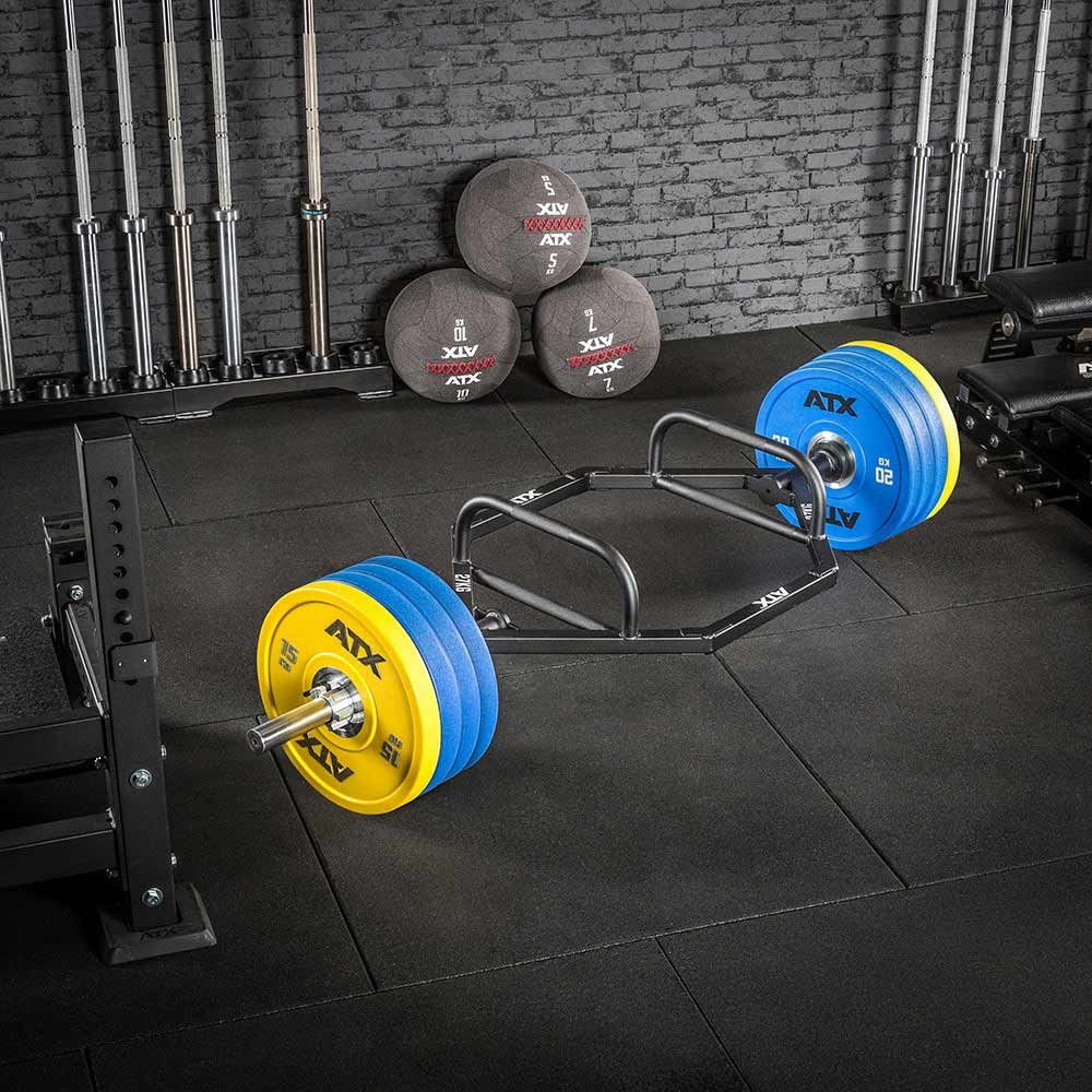 Les disques se chargent côte à côte comme sur une barre traditionnelle, la poignée est placée perpendiculairement à la barre elle-même, en facilitant la prise en main qui sera plus forte et qui empêchera la génération de forces de rotation sur le bassin lors de l’exercice de soulevé de terre.
