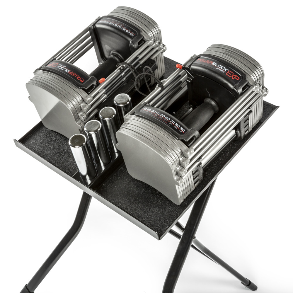 Le système le plus compact des haltères ajustables - les Powerblock avec support de sélection :