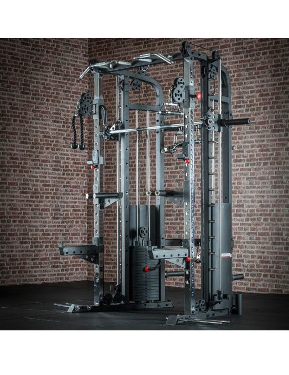 Compact et polyvalent, l’appareil de musculation Multi-gym, aussi appelé Multistation, s’apparente le plus souvent à une cage à squat couplée à une Smith Machine équipée de systèmes à poulies, surmontée d’une barre de traction et sur laquelle une multitude d’accessoires peuvent être adaptés, des célèbres barres à dips jusqu’au Rowing T-Bar ou à des options pour l’entraînement des cuisses.