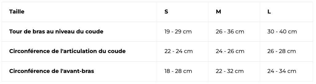 Guide des tailles disponibles pour l'accessoire de renfort du coude en bambou-carbone