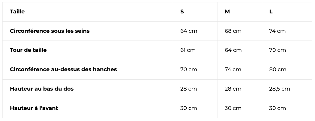 Guide des tailles disponibles pour le corset de sport pour le maintien de la zone dorsale - Fermeture zippé