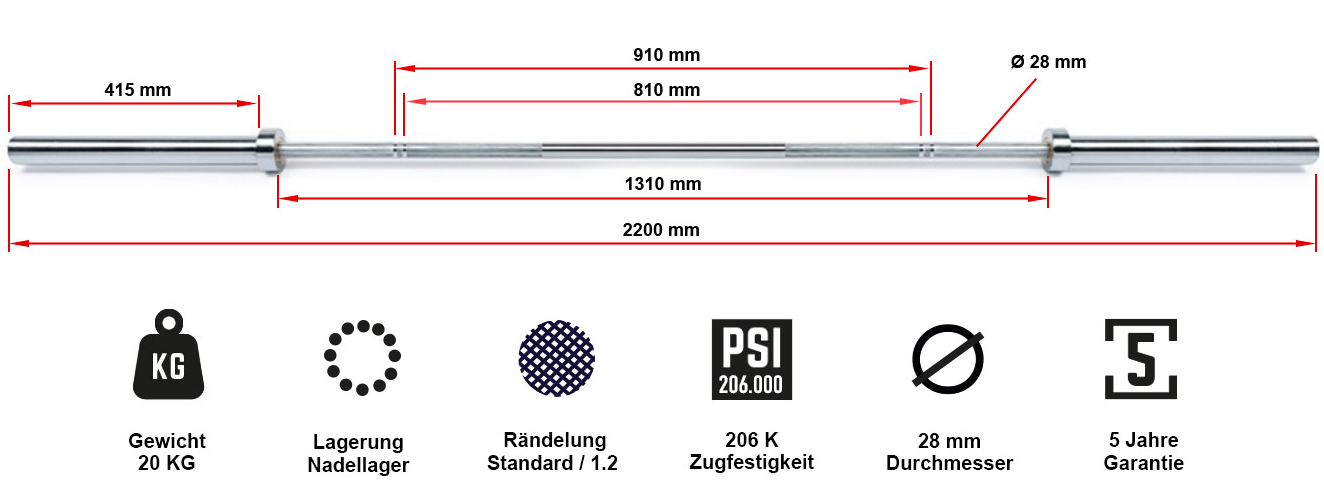 - Poids total de la barre : 20 kg