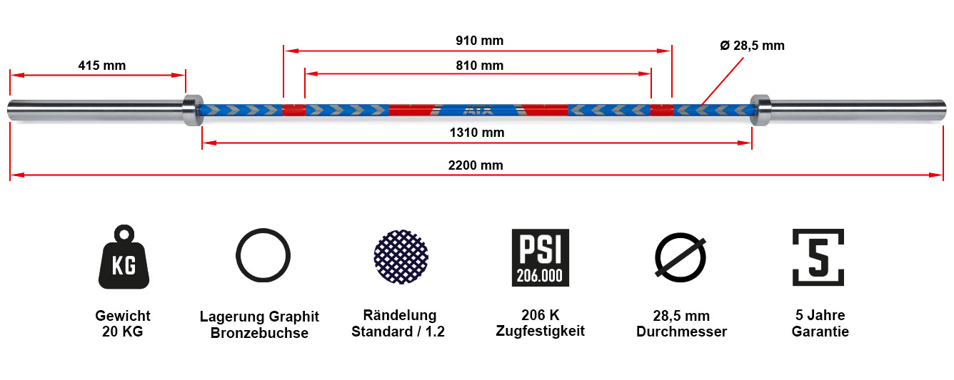 Cette barre droite olympique est un élément indispensable dans une salle de musculation professionnelle ou dans un home gym. Ayant une longueur de 220 cm, cette barre olympique est dotée d'une capacité de charge de 700 kg, ce qui en fait une barre haut de gamme avec une résistance exceptionnelle. Cette barre d'haltères longue a été conçue avec de l'acier spécial à haute résistance à la traction de 206 000 lb/po2. De plus, les supports pour disques de poids olympiques, disposent de bagues en bronze graphite autolubrifiant. En plus, pour vous permettre une bonne prise en main de la barre d'haltères longue ATX, le diamètre de la poignée est de 28,5 mm. En plus de sa conception particulièrement robuste, le design est également l'un des points forts de la barre d'haltère olympique. Effectivement, la marque ATX met à votre disposition 4 design uniques et exceptionnels qui feront parfaitement la différence au sein de votre espace d'entraînement.