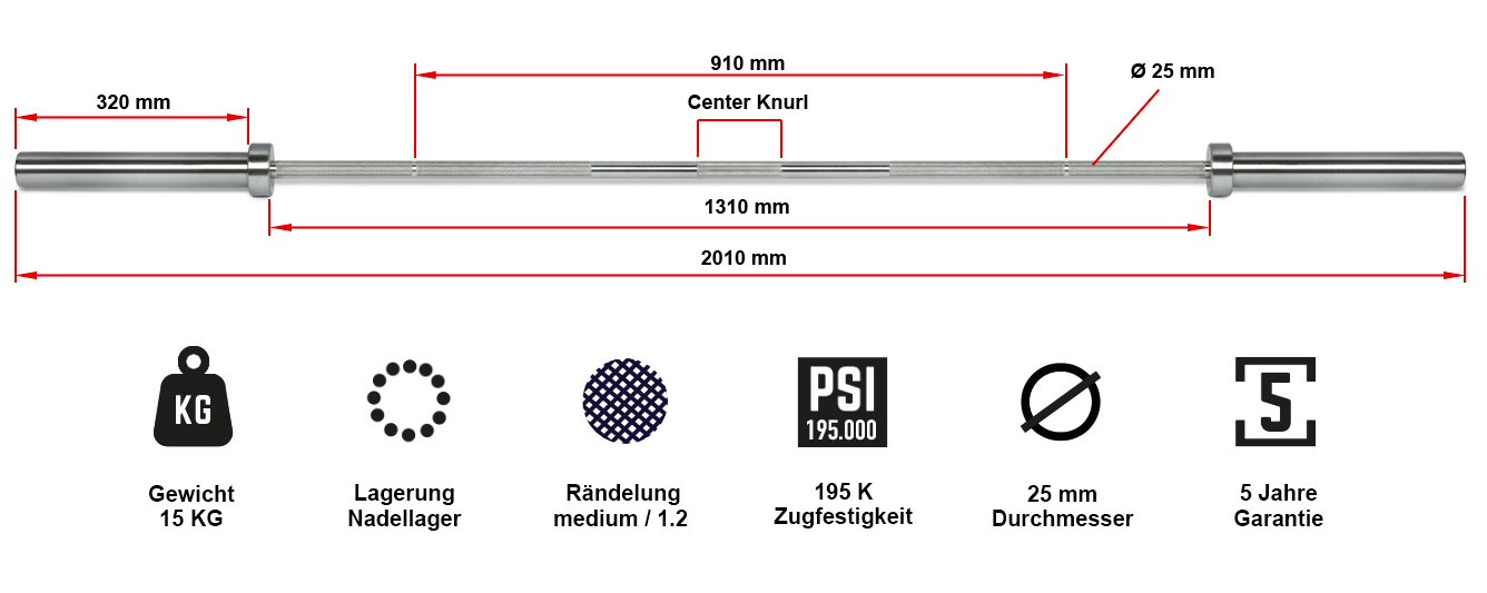La coordination optimale des caractéristiques mécaniques de résistance <> ténacité sont une garantie pour les caractéristiques typiques de cette barre d'haltérophilie professionnelle. Le moletage moyen parfait avec marquage international de largeur de poignée-haltérophilie de cette women barre de musculation, assure une prise en main confortable et sûre.