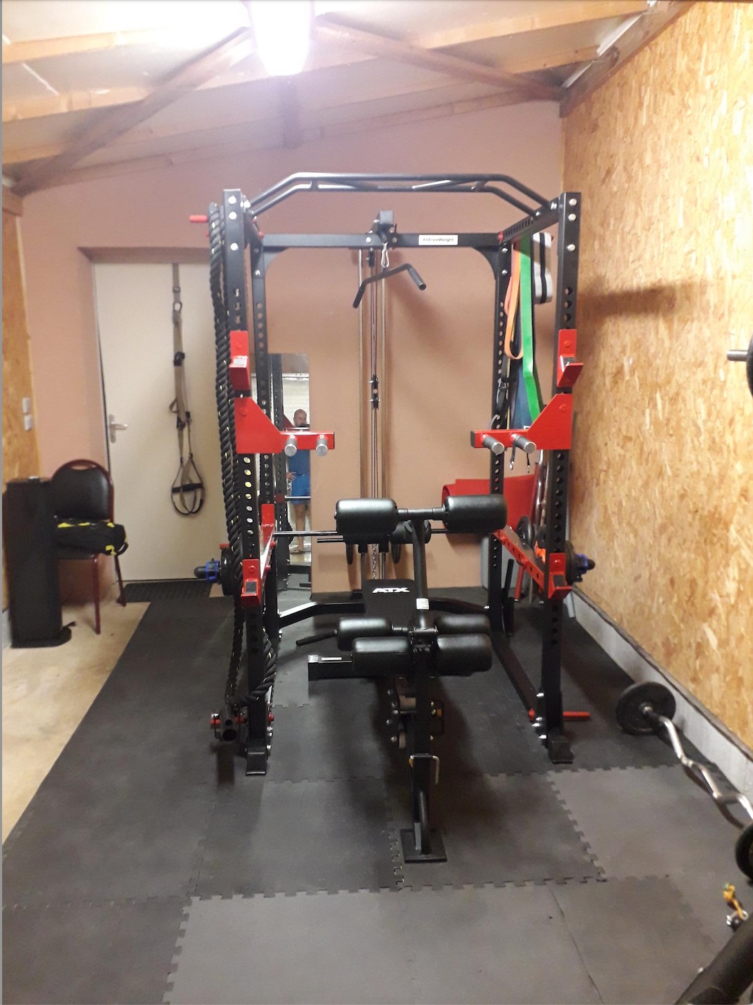 Dans l’optique de réaliser des entraînements variés et surtout complets, Johann s’est muni de divers équipements de musculation. L’appareil central de son home gym est une cage à squat de musculation avec station à poulie haute et basse comprenant divers accessoires d’entraînement. Afin d’élargir les possibilités d’exercices, ce pratiquant sportif a acquis un banc de musculation réglable. Enfin, pour que ces équipements soient parfaitement fonctionnels, le culturiste a fait l’acquisition d’une barre de curl coudée, de quelques plaques de poids, d’un kit d’haltères hexagonaux, ainsi que d’une option leg curl et leg extension. L’ensemble de ces équipements de musculation viennent se compléter pour que l’heureux propriétaire puisse profiter d’un très large panel d’exercices réalisables !
