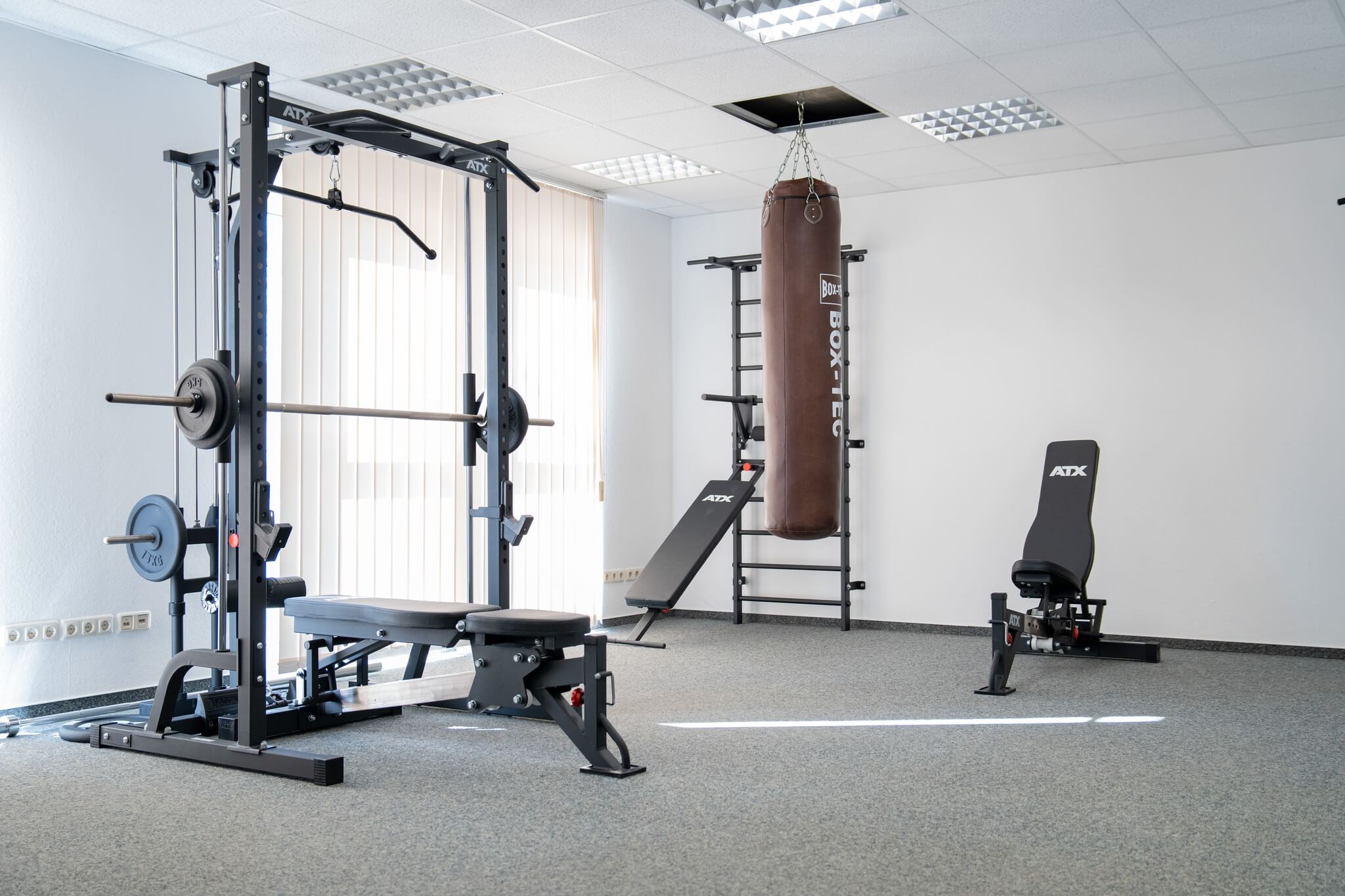 Ce Home-Gym implanté dans une entreprise est équipé d'une Smith Machine Multipress avec une colonne de poids à charge libre permettant d'effectuer des exercices de tirage.