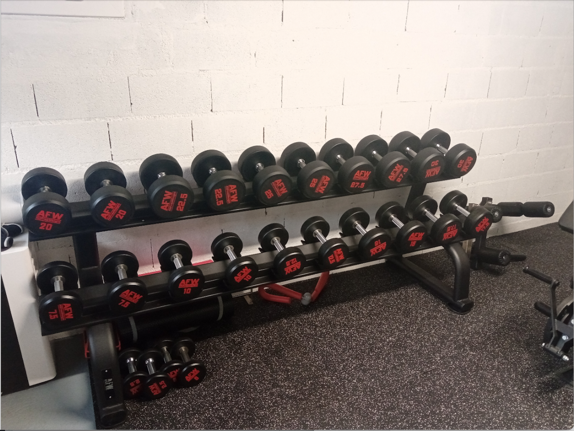 Pour un home-gym de musculation sécuritaire et en ordre ; ce sportif a fait le choix d'installer dans sa salle d'entraînement, un rack de stockage pour ses haltères. Ce rack de rangement stable et design met à disposition de son utilisateur deux rangées pouvant accueillir jusqu'à 10 paires d'haltères de 5 à 30 kg. Ultra-pratique, ce support de stockage pour haltères est très design pour donner un aspect très rassurant et professionnelle à votre salle de musculation à domicile.