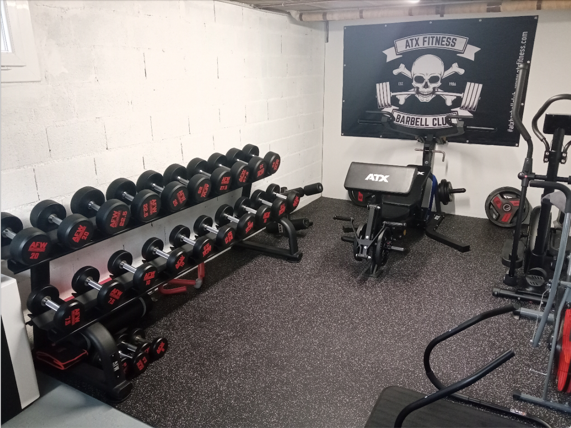 Pour s'approprier son espace d'entraînement, Guillaume a mis en place un drapeau ATX de l'édition Barbell Club avec le logo tête de mort. Fan de la marque ATX fitness, le sportif a choisi cette grande bannière pour donner un côté rebelle à son home-gym reflétant parfaitement les valeurs de sa marque préférée. En plus, cela permet à sa salle de training d'être plus agréable à l'œil offrant une motivation d'entraînement supplémentaire !