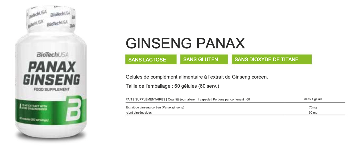 Dans ce cas, le panax ginseng de la marque Biotech USA est sans aucun doute le supplément nutritionnel qui répondra à vos besoins grâce à sa composition !