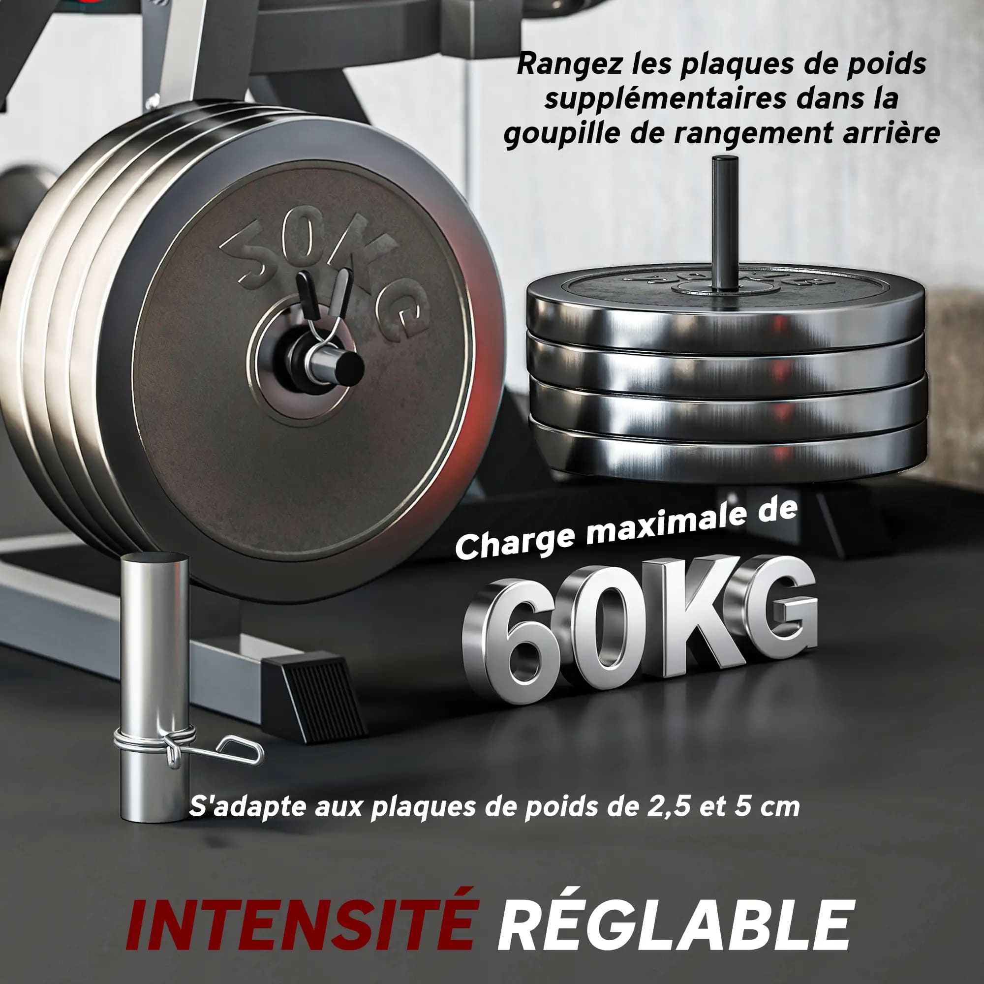 Compatible avec disques standards (25 mm) et olympiques (50 mm), cette station à charge libre permet d’ajuster facilement la résistance et de progresser de manière constante jusqu’à 60 kg.