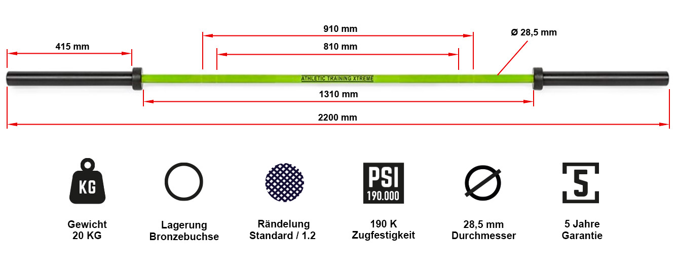 La barre de musculation est l'équipement de base à acquérir pour vos trainings en home-gym. Cette barre droite est dotée d'un diamètre olympique : 50 mm. Avec cette barre olympique vous pourrez rendre vos entraînements polyvalents. En effet, vous pouvez utiliser la barre 220 cm avec des chandelles pour l'exercice de développé couché ou encore avec une rack de musculation pour effectuer des squats. Cette barre de musculation mesure 220 cm de long et pèse 20 kg. Pour une prise en main confortable, la barre de fitness offre un diamètre de 28,5 mm. Conçue en céramique, la barre olympique donne accès à une excellente robustesse et une résistance à l'usure. La barre en céramique est fabriquée par la marque de luxe ATX avec un revêtement vert design. Pour une adhérence optimale, la barre de musculation est équipée d'un moletage de haute qualité. La barre verte en céramique est capable de supporter des charges allant jusqu'à 600 kg. La résistance à la traction de la barre olympique est de 190 000 PSI.