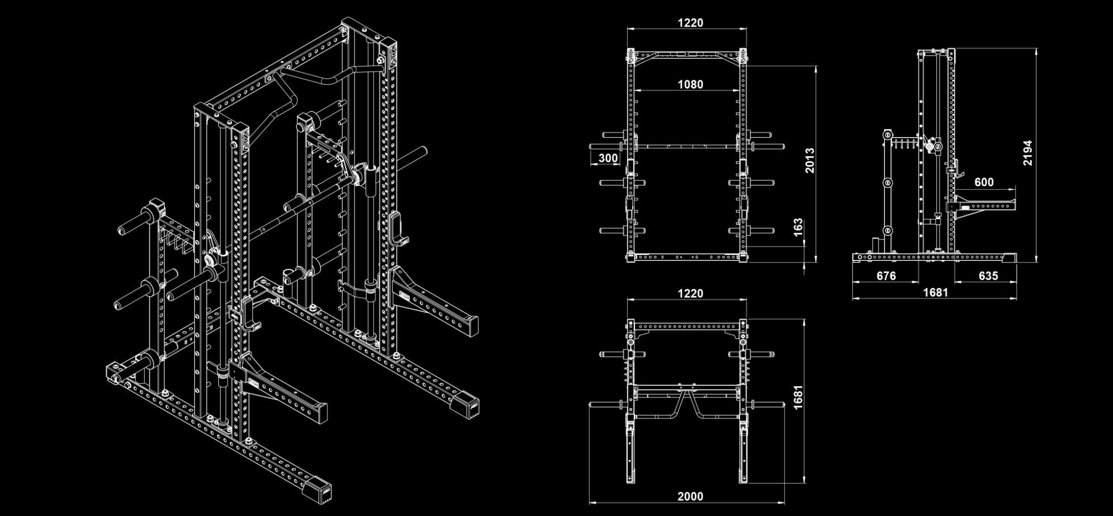 - Capacité de charge : Multipresse (200 kg) / J-Hooks (500kg) / Spotter arms (400kg) / Barre de traction (200 kg)