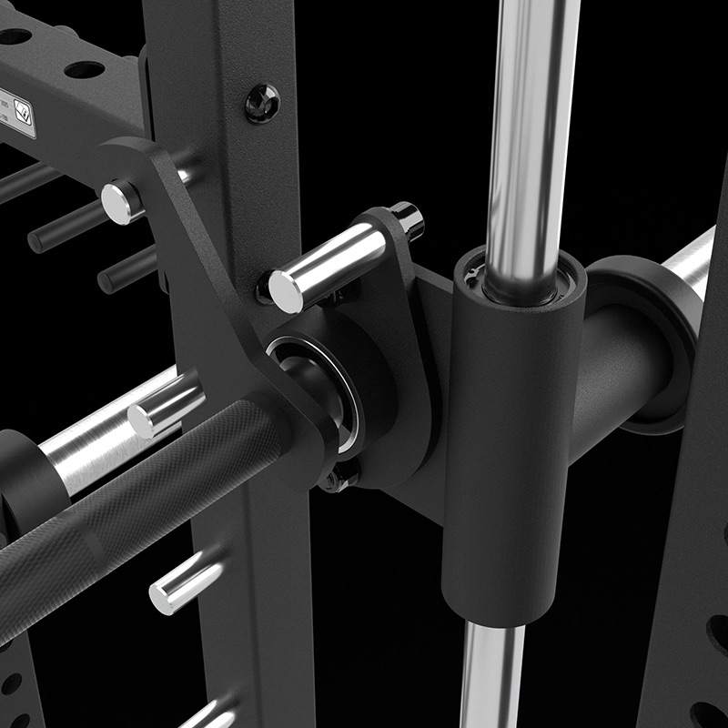 Cette Smith Machine avec poulie à charge libre offre la particularité de combiner entraînement en guidé et en libre, grâce à l’intégration de crochets en J massifs et de bras de sécurité (spotter arms), tous deux inclus et conçus pour supporter des charges très élevées jusqu'à 500 kg.