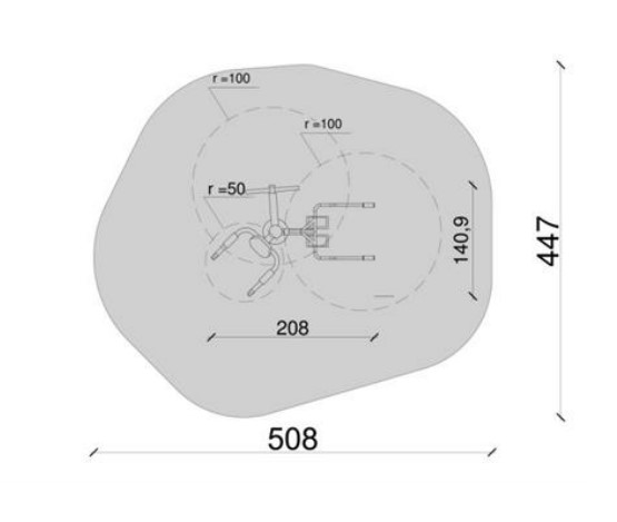 Pour accentuer le critère de sécurité de votre triple atelier de musculation pour parcours santé, il est nécessaire d'installer du revêtement de sol aux normes autour de votre matériel. Ici, pour la station de fitness pour personnes en fauteuil roulant, il faut compter un périmètre de sécurité de 508 x 447 cm.