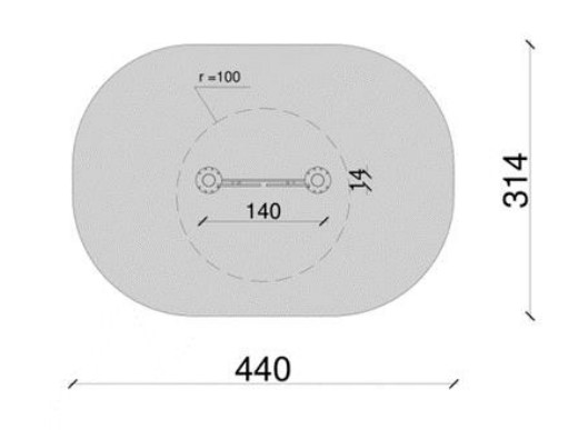 Pour accentuer le critère de sécurité de votre agrès de fitness pour personnes handicapées, il est nécessaire d'installer du revêtement de sol aux normes autour de votre matériel. Ici, pour la roue à épaules outdoor, il faut compter un périmètre de sécurité de 440 x 314 cm.