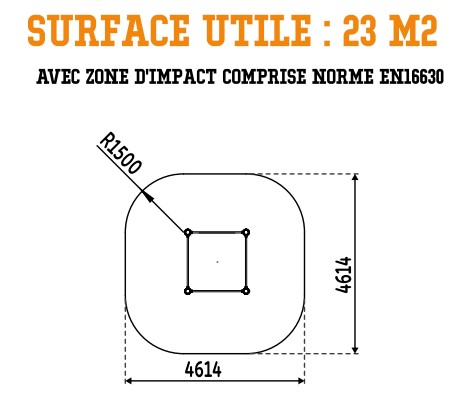 Autour de votre structure d'entraînement de cross-training en plein air, vous devez absolument intégrer une zone d'impact autour de votre équipement afin d'assurer une sécurité optimale. Pour le circuit de street workout extérieur, la zone de sécurité avec sol adapté doit faire : 4,62 mètres x 4,62 mètres.