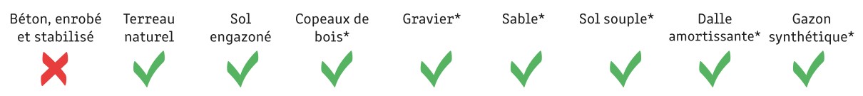 Afin de respecter la norme EN 16630:2015, il est essentiel d'installer votre matériel de fitness en plein aire sur une surface plate et stable. Les différents types de sol pouvant être installés autour de votre équipement de street workout :