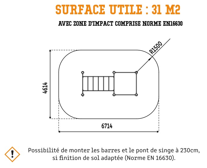 Autour de votre structure d'entraînement de cross-training en plein air, vous devez absolument intégrer une zone d'impact autour de votre équipement afin d'assurer une sécurité optimale. Pour le circuit de street workout extérieur, la zone de sécurité avec sol adapté doit faire 31 m².