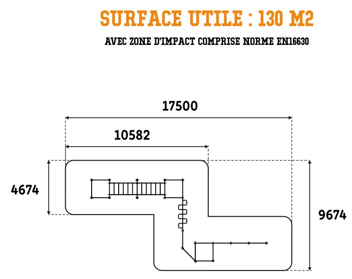 Autour de votre structure d'entraînement de cross-training en plein air, vous devez absolument intégrer une zone d'impact autour de votre équipement afin d'assurer une sécurité optimale. Pour le circuit de street workout extérieur, la zone de sécurité avec sol adapté doit faire : 130 m²