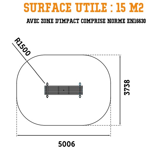Autour de votre structure d'entraînement en plein air, vous devez absolument intégrer une zone d'impact autour de votre équipement afin d'assurer une sécurité optimale. Pour l'agrès outdoor, la zone de sécurité avec sol adapté doit faire : 15 m².