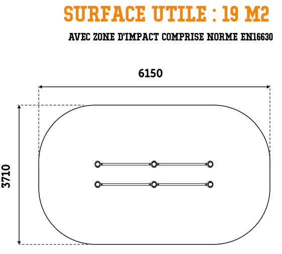 Autour de votre structure d'entraînement de cross-training en plein air, vous devez absolument intégrer une zone d'impact autour de votre équipement afin d'assurer une sécurité optimale. Pour l'agrès de street workout extérieur, la zone de sécurité avec sol adapté doit faire 19 m².