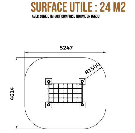 Autour de votre structure d'entraînement en plein air, vous devez absolument intégrer une zone d'impact autour de votre équipement afin d'assurer une sécurité optimale. Pour le filet à ramper pour parcours du combattant, la zone de sécurité avec sol adapté doit faire 24 m².