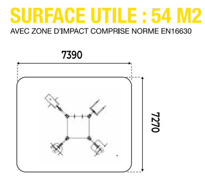 Autour de votre structure d'entraînement en plein air, vous devez absolument intégrer une zone d'impact autour de votre équipement afin d'assurer une sécurité optimale. Pour la l'agrès outdoor multipostes, la zone de sécurité avec sol adapté doit faire : 54 m².