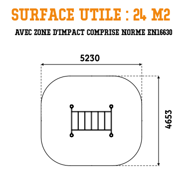 Autour de votre structure d'entraînement en plein air, vous devez absolument intégrer une zone d'impact autour de votre équipement afin d'assurer une sécurité optimale. Pour le circuit de street workout extérieur pour PMR, la zone de sécurité avec sol adapté doit faire 24 m².