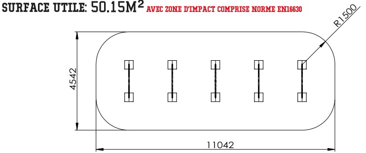 Autour de votre structure d'entraînement de promenade sportive en plein air, vous devez absolument intégrer une zone d'impact autour de votre équipement afin d'assurer une sécurité optimale. Pour le circuit sportif extérieur, la zone de sécurité avec sol adapté doit faire 50.15 m².