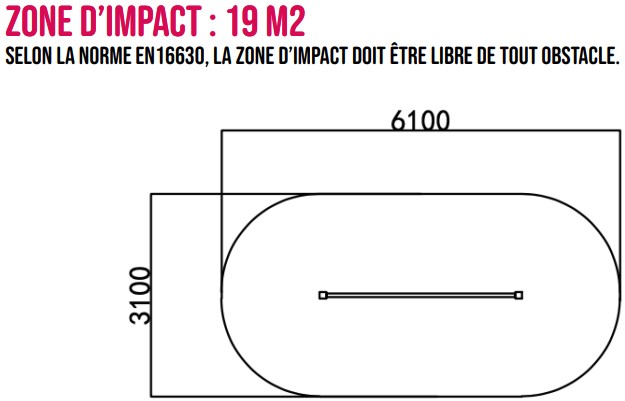 Autour de votre structure d'entraînement de promenade sportive en plein air, vous devez absolument intégrer une zone d'impact autour de votre équipement afin d'assurer une sécurité optimale. Pour le pont de tarzan extérieur, la zone de sécurité avec sol adapté doit faire 19 m².