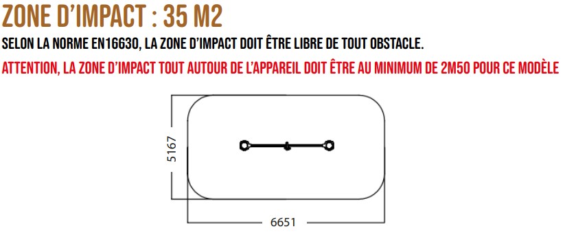 Pour une sécurité optimisée, il faut absolument prévoir une surface autour de votre équipement sportif extérieur avec du revêtement de sol adapté et norme afin d'éviter les chocs et les accidents. Pour cet appareil de ninja warrior, la zone de sécurité doit présenter les dimensions suivantes : 35 m².
