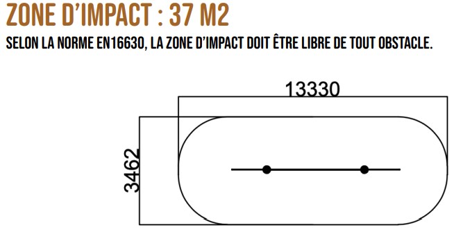 Autour de votre structure d'entraînement pour parcours du combattant, vous devez absolument intégrer une zone d'impact autour de votre équipement afin d'assurer une sécurité optimale. Pour la corde d'agilité extérieur, la zone de sécurité avec sol adapté doit faire 37 m².
