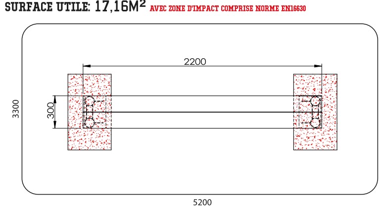 Autour de votre structure d'entraînement pour parcours du combattant, vous devez absolument intégrer une zone d'impact autour de votre équipement afin d'assurer une sécurité optimale. Pour la table irlandaise extérieur, la zone de sécurité avec sol adapté doit faire 17,16 m².