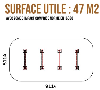 Autour de votre structure d'entraînement en plein air, vous devez absolument intégrer une zone d'impact autour de votre équipement afin d'assurer une sécurité optimale. Pour les poutres dessous-dessus pour parcours du combattant, la zone de sécurité avec sol adapté doit faire 47 m².