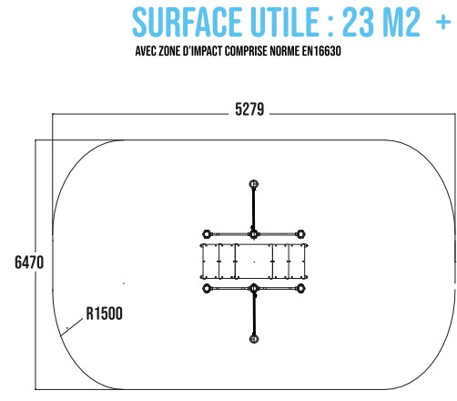 Autour de votre module de sport sénior en plein air, vous devez absolument intégrer une zone d'impact autour de votre équipement afin d'assurer une sécurité optimale. Pour le circuit sportif extérieur pour sénior avec escalier, la zone de sécurité avec sol adapté doit faire 23 m².