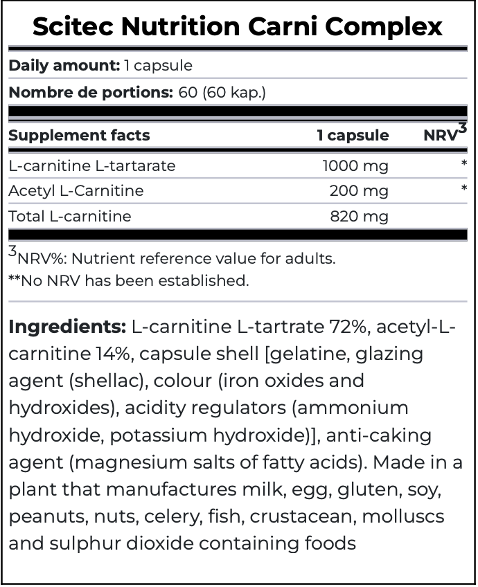 Les gélules de carnitine Scitec nutrition sont fabriquées dans un atelier utilisant du lait, des œufs, du gluten, du soja, des arachides, des fruits à coque, du céleri, du poisson et des crustacés.