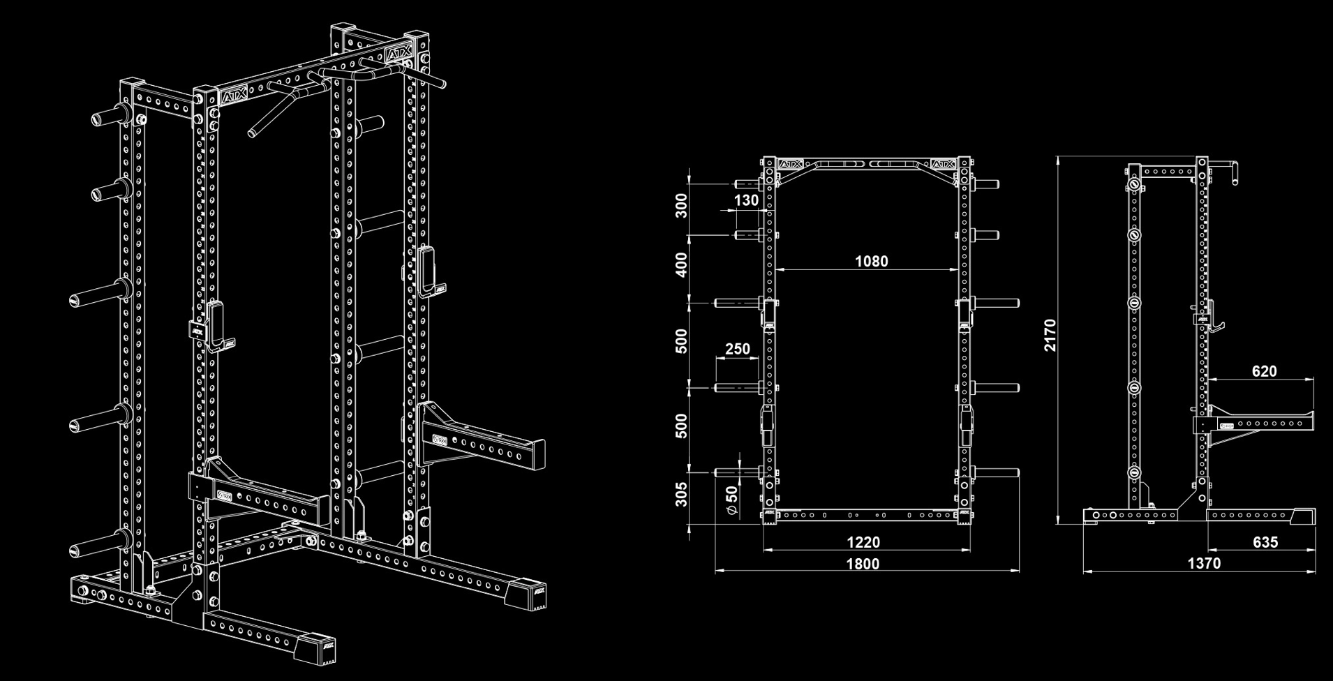 Caractéristiques techniques du half rack à squat ATX avec extension de rangement pour plaques de poids :