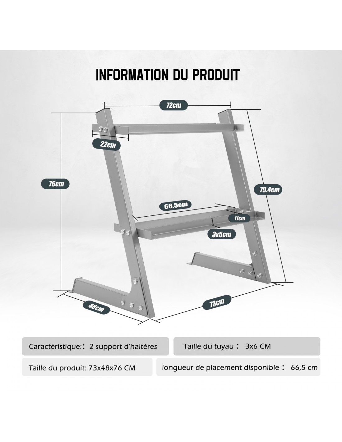 - Taille du rack pour haltères : longueur: 72 cm largeur: 48 cm hauteur: 76 cm