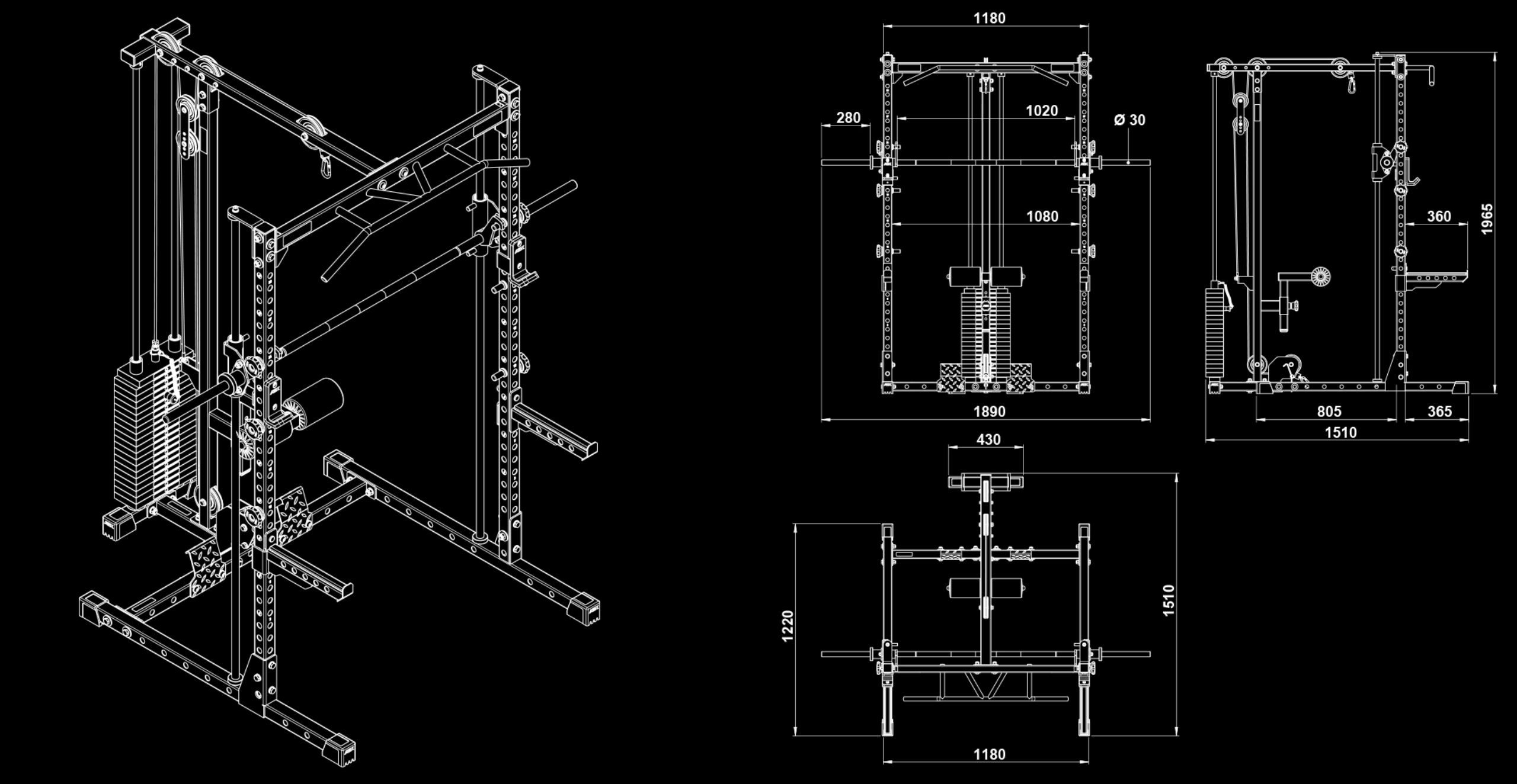 - Largeur support d’haltères 1180 mm avec grille de 30 positions et repères laser pour réglage précis