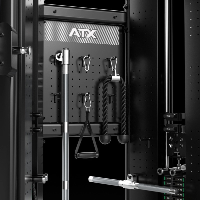 La machine cross over ATX functional trainer est livrée avec un ensemble complet de poignées et accessoires, comprenant une barre transversale large d’environ 120 cm, une barre de traction droite d’environ 50 cm, deux poignées à une main, une boucle de pied et quatre mousquetons. Un système de rangement intégré sur la paroi arrière permet de conserver tous les accessoires organisés et facilement accessibles, optimisant ainsi l’espace d’entraînement et le confort d’utilisation sans nécessiter d’achats supplémentaires.