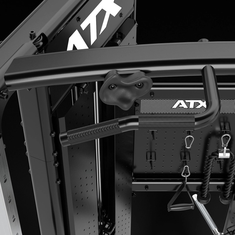 Pour enrichir encore les possibilités d’entraînement, cette machine cross trainer est équipée d’un dispositif roller band peg permettant l’ajout de bandes de résistance afin de créer une charge dynamique progressive. La présence d’une barre de traction intégrée avec poignées d’escalade transforme cette station poulie vis à vis ATX en une solution complète pour le travail du dos, des bras, de la force de préhension et de la stabilité du tronc, tout en favorisant la coordination et le contrôle postural.