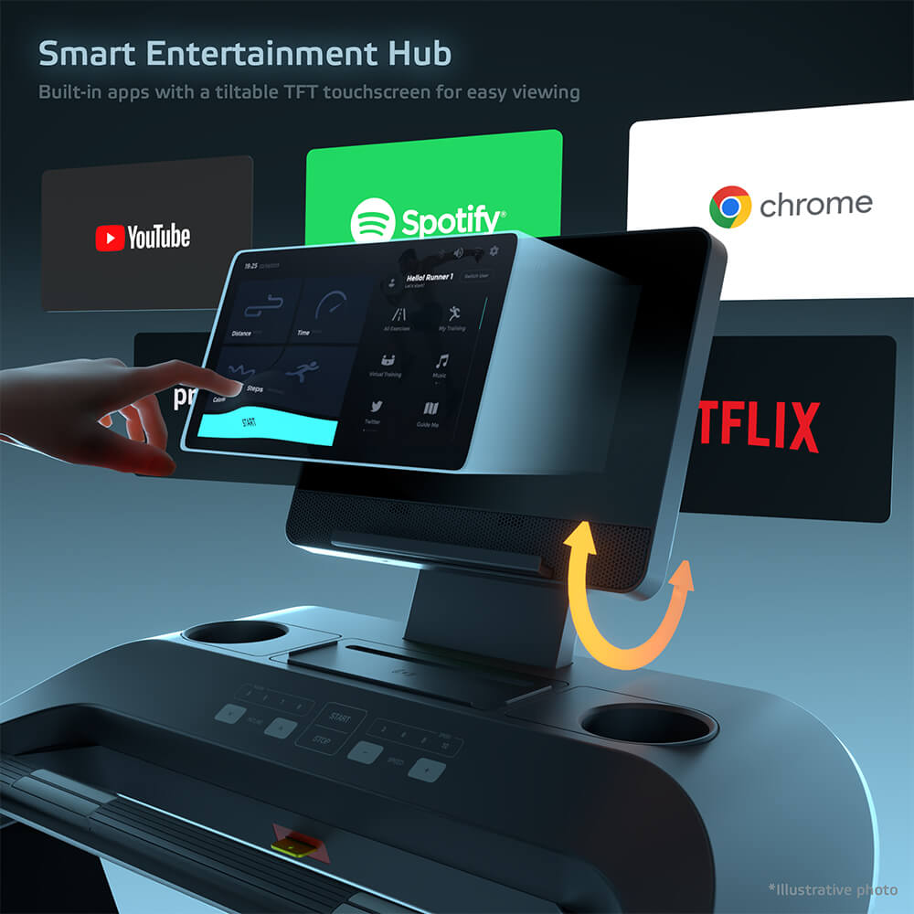 Le confort et le divertissement sont au centre de l’expérience grâce à l’écran TFT tactile de 15,6 pouces, qui affiche temps, distance, vitesse, calories, fréquence cardiaque, nombre de pas et inclinaison. Des applications préinstallées comme YouTube, Netflix, Spotify, Chrome, Facebook, Prime Video, Instagram, Twitter et Amazon Music rendent chaque séance plus agréable.