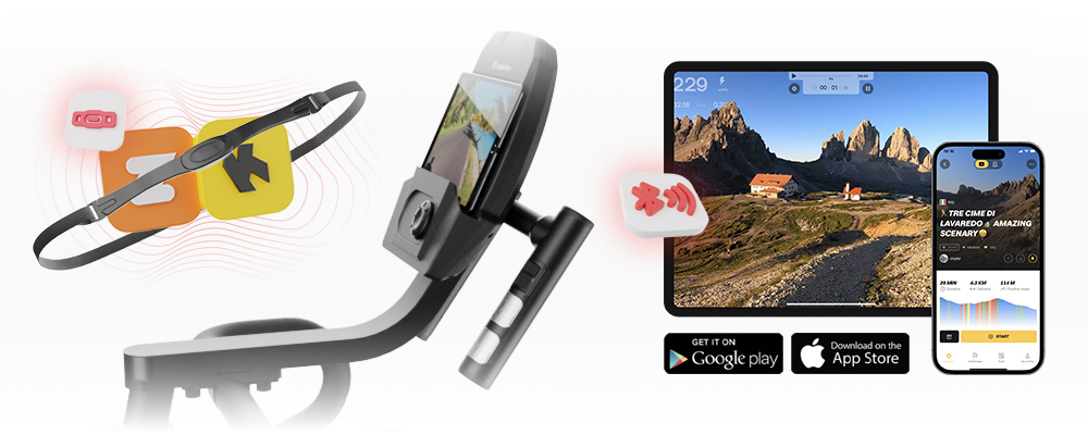 Pour vous divertir lors de vos séances, vous pouvez également effectuer une séance de façon connectée avec les nombreuses applications compatibles avec votre vélo d'exercice par Bluetooth comme Swift, Kinomap et Fitshow.